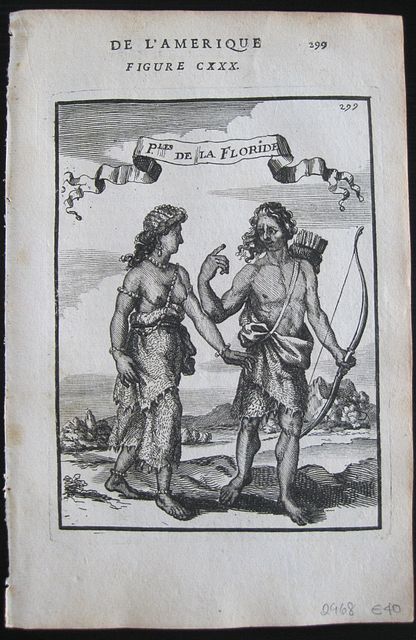 Copper engraved illustration of Native Floridians from Mallet's "Description de l'Univers" 1st edition. Text to verso. Dark impression; light toning; light spotting left blank margin.