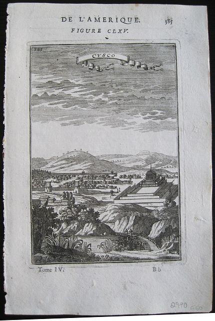 Copper engraved view of Cusco; from Mallet's "Description de l'Univers" 1st edition. Text to versos. Dark impression; light soiling to margins.