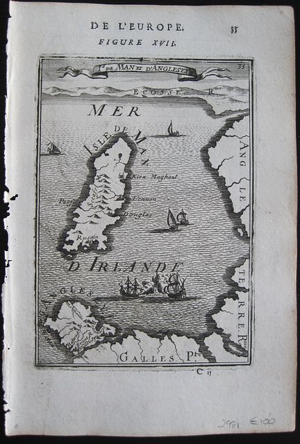 Copper engraved map of the Isle of Man and Anglesey from Mallet's "Description de l'Univers" 1st edition. Text to verso.