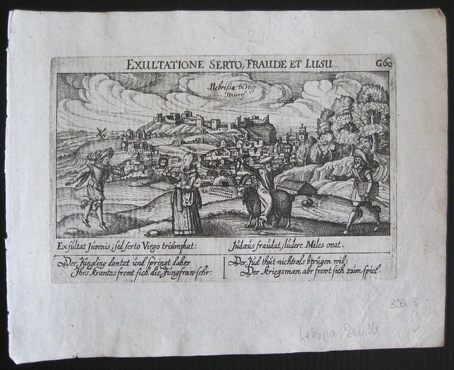 View of Lebrija after Braun & Hogenberg ; above Latin tag: