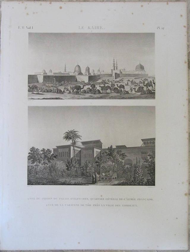 Copper engraved views, 2 on 1 page, of the garden of rhe Palace of Elfy-Bey, quarters of the French Army, and of a caravan close to the city of Tombs, Cairo from the first volume of the "Etat Modene "of the "