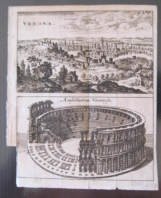 Copper engraved miniature view of Verona and the ampitheatre, from Sandrart's: