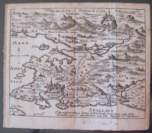 The map shows the city of Split/ Spallato with the fortress of Klis/Clissa behind Folded; Light toning.