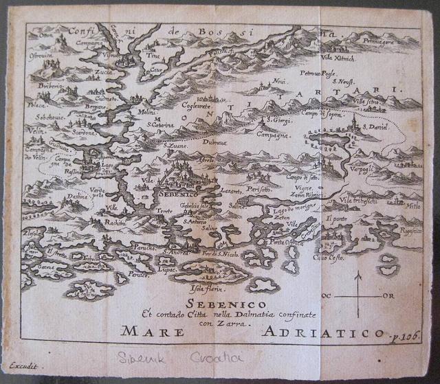 Copper engraved miniature map of Sibeinik on the Dalmatian coast of Croatia from Sandrart's: